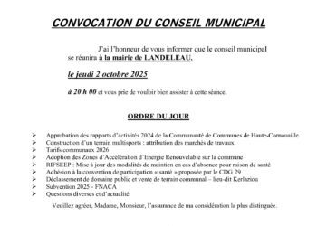 Le conseil municipal se réunira à la mairie de Landeleau le jeudi 02 octobre 2025 à 20h00 et vous prie de... Read More → Convocation au Conseil Municipal du jeudi 02 octobre 2025 à 20h00