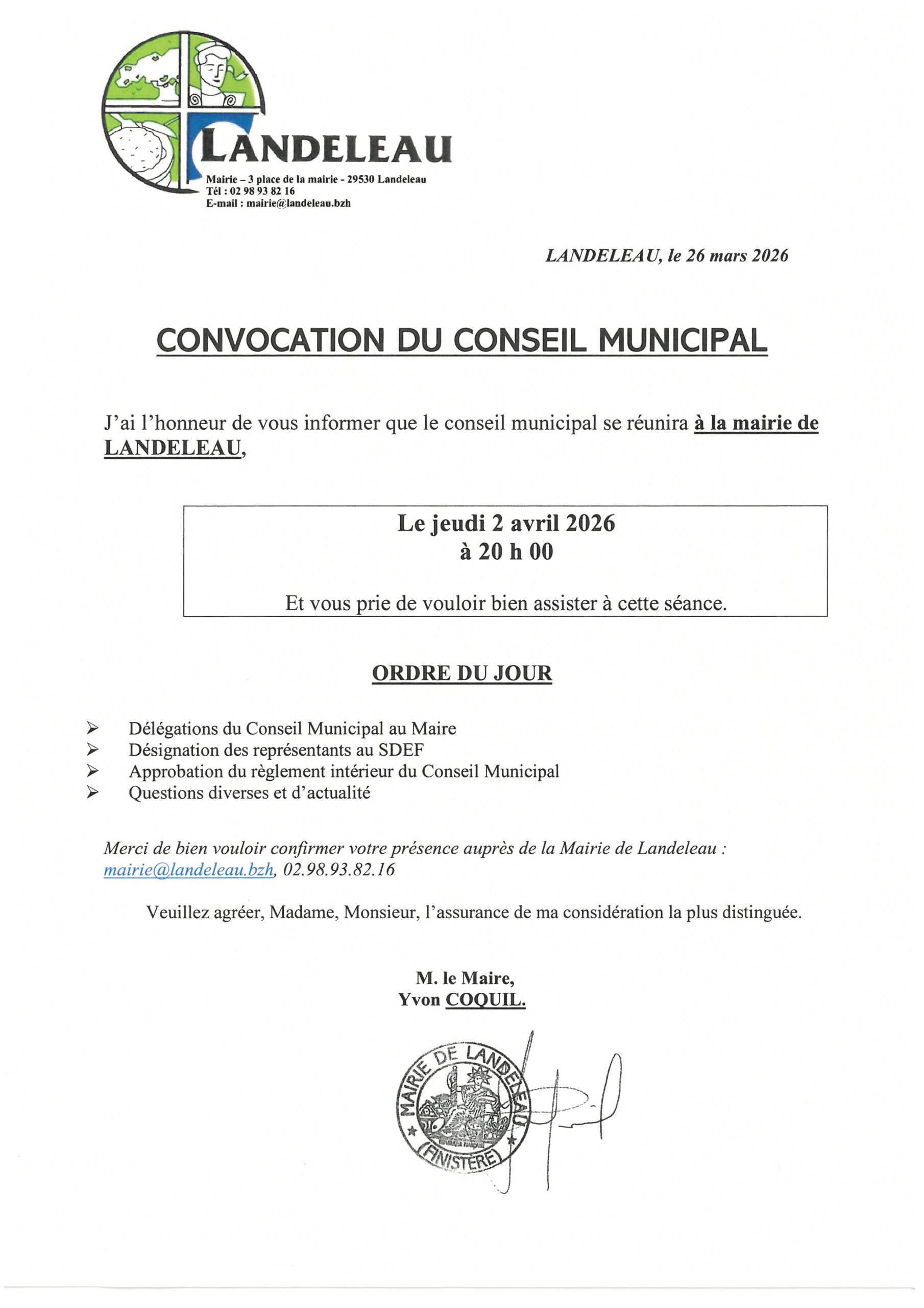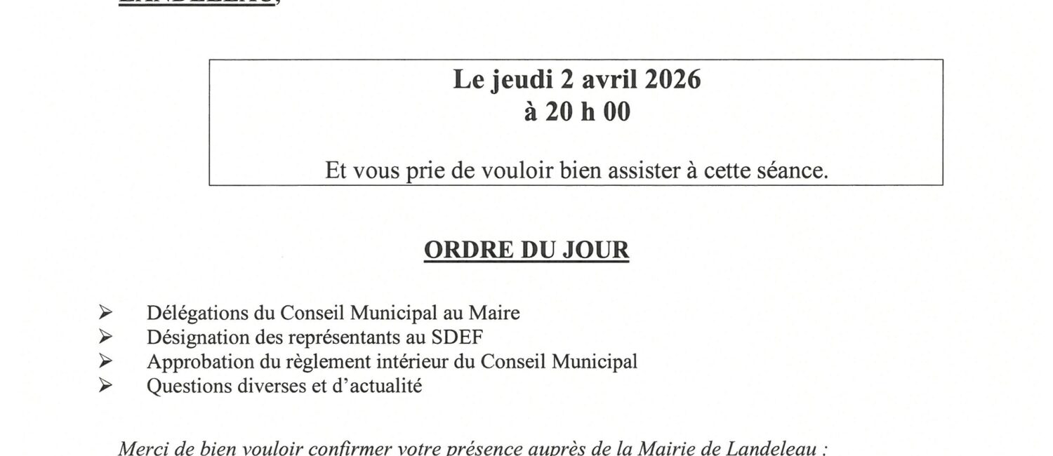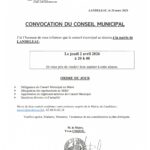 Le conseil municipal se réunira le jeudi 02 avril 2026 à 20h00 avec comme ordres du jour :