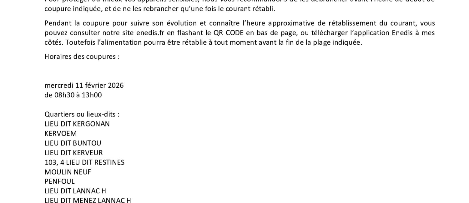 Horaires et date des coupures : mercredi 11 février 2026 de 08h30 à 13h00. Les quartiers ou lieux-dits concernés sont : LIEU DIT KERGONAN, KERVOEM, LIEU DIT BUNTOU, LIEU DIT KERVEUR, 103, 4 LIEU DIT RESTINES, MOULIN NEUF, PENFOUL, LIEU DIT LANNAC H, LIEU DIT MENEZ LANNAC H, N32 LIEU DIT KERBIZIEN, LIEU DIT RESTANOIK, LIEU DIT PENFOUL, 5 LIEU DIT KERVOEN, BOURG, LIEU DIT KERHAMON, du 11 au 17, 10 au 14 rue DE POULMOAN et LIEU DIT CLOUARIC.
