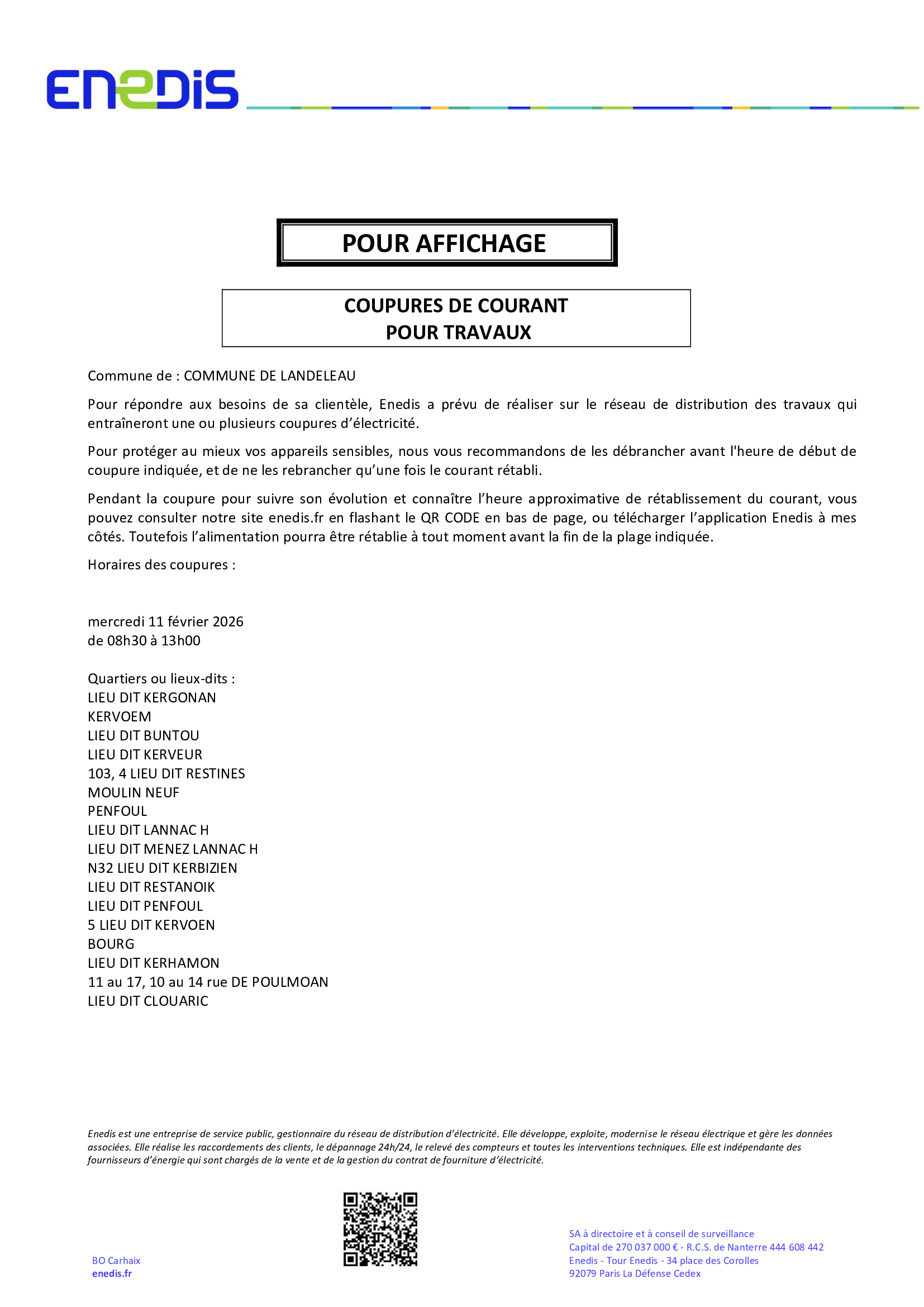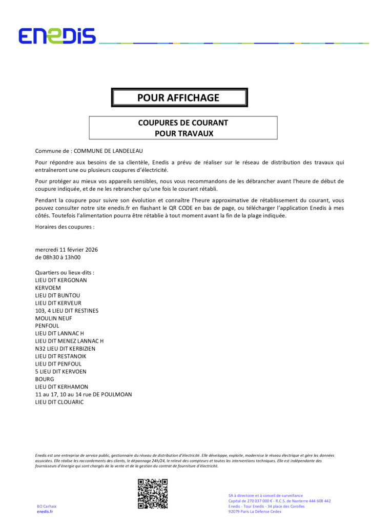 Pendant la coupure pour suivre son évolution et connaître l’heure approximative de rétablissement du courant, vous pouvez consulter notre site enedis.fr en flashant le QR CODE en bas de page, ou télécharger l’application Enedis à mes côtés. Toutefois l’alimentation pourra être rétablie à tout moment avant la fin de la plage indiquée.