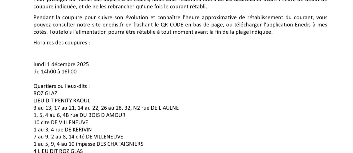Pendant la coupure pour suivre son évolution et connaître l’heure approximative de rétablissement du courant, vous pouvez consulter notre site enedis.fr en flashant le QR CODE en bas de page, ou télécharger l’application Enedis à mes côtés. Toutefois l’alimentation pourra être rétablie à tout moment avant la fin de la plage indiquée.