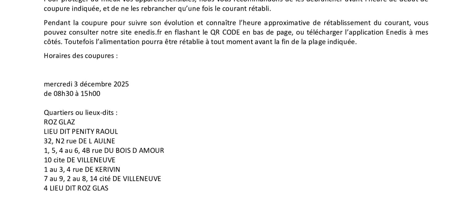 Pendant la coupure pour suivre son évolution et connaître l’heure approximative de rétablissement du courant, vous pouvez consulter notre site enedis.fr en flashant le QR CODE en bas de page, ou télécharger l’application Enedis à mes côtés. Toutefois l’alimentation pourra être rétablie à tout moment avant la fin de la plage indiquée.