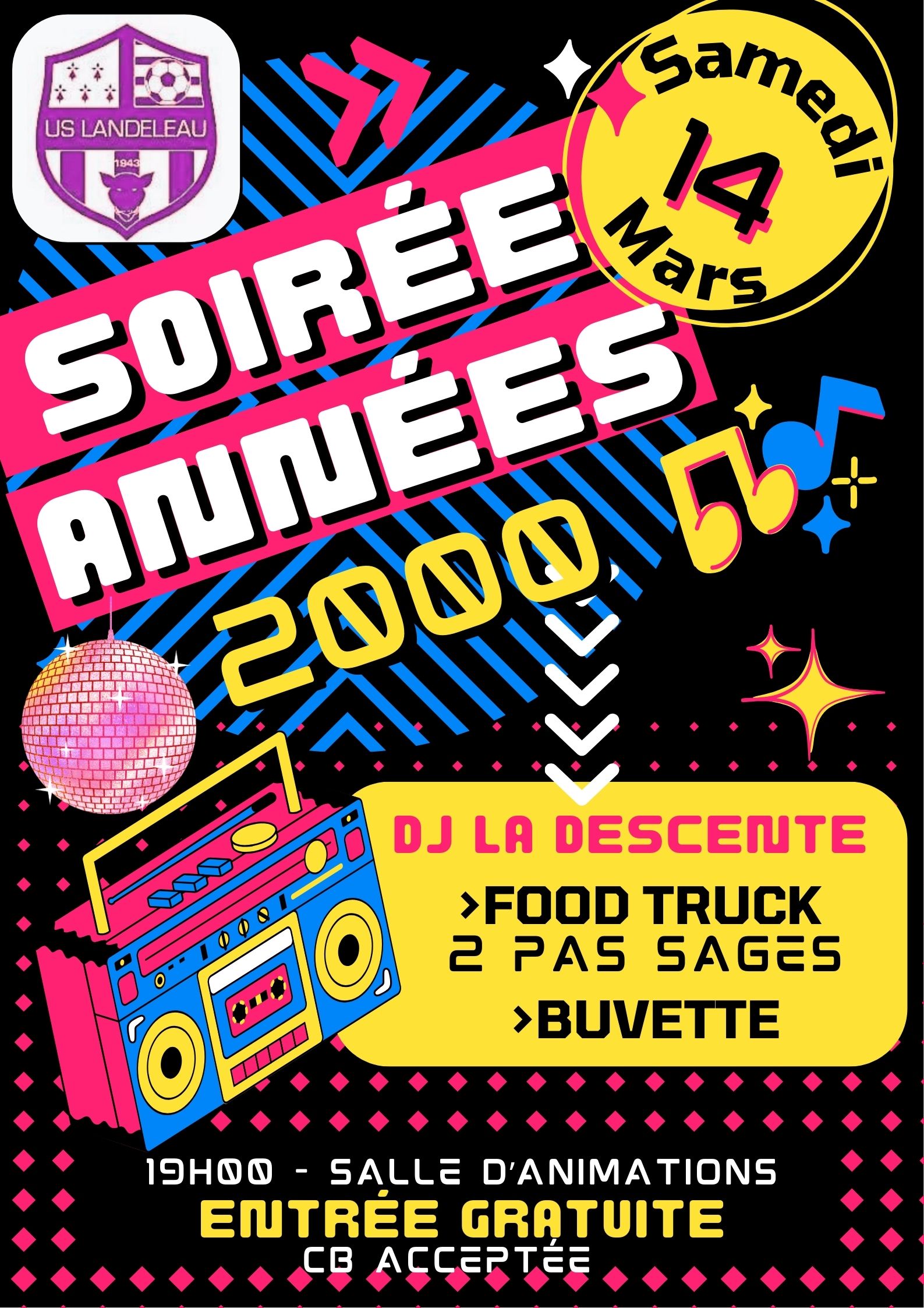 U.S Landeleau vous propose une soirée spéciale sur le thème “Années 2000” à la salle d’animation le samedi 14 mars à partir de 19h00. La soirée sera animée par DJ La Descente, l’entrée est gratuite et le Food Truck “2 Pas Sage” sera présent pour la restauration.